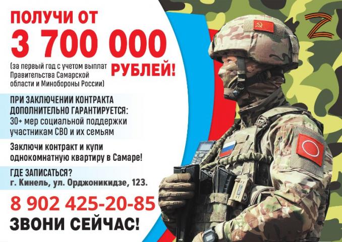 Присоединяйся к СВОим! Заключи контракт и получи от 3,7 млн рублей за первый год (с учетом выплат Правительства Самарской области и Минобороны России).